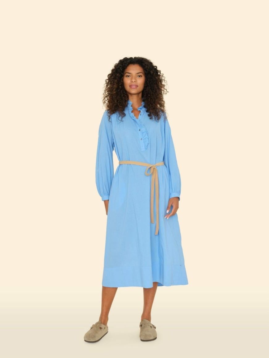 Pro ten šmrnc. Caspy je novinkou této sezóny v našem klasickém lehkém tkaném bavlněném poplínu pro ležérní vzhled a pocit. Inspirovaný naším nejprodávanějším topem Caspian Top, Caspy se vyznačuje volánkovou henley s detaily volánek po celém výstřihu a přední léze. Tyto vyvýšené midi šaty mají nařasení po celé délce, zavazování v pase z umělého semiše a kapsy v bočních švech.