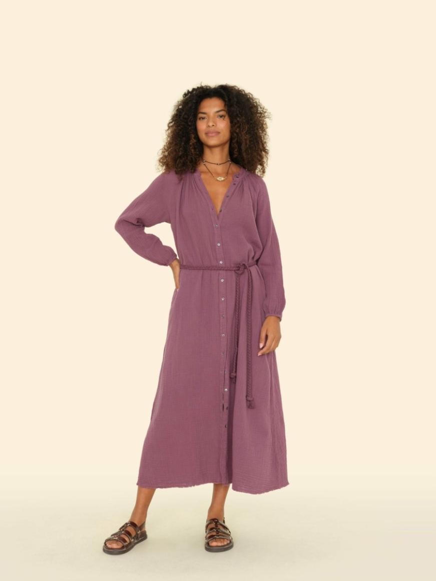 Pretty Please. Andrea je novinkou této sezóny v naší prané oboustranné bavlněné gáze pro měkký, jemně zmačkaný pocit. Andrea jsou midi šaty s knoflíky vpředu, výstřihem s neopracovaným lemem, raglánovými rukávy, nařaseným lemem, kapsami v bočních švech, zapleteným páskem a neopracovaným lemem.