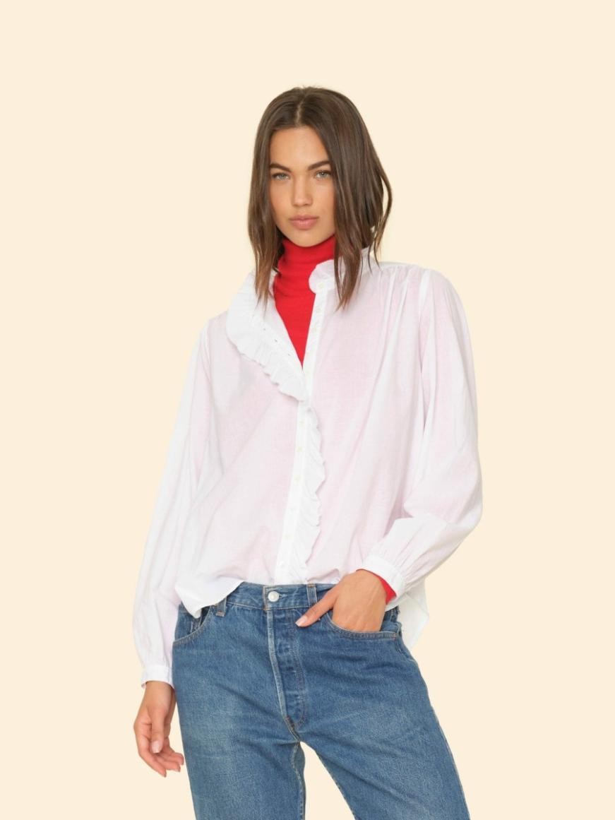 Flæsebluse. Nicholson er ny i denne sæson i vores klassiske letvægtsvævede bomuldspoplin, der giver et komfortabelt look. Nicholson er en skjorte med knapper foran og rå kantede flæsedetaljer langs hele halsen og frontstolpen.