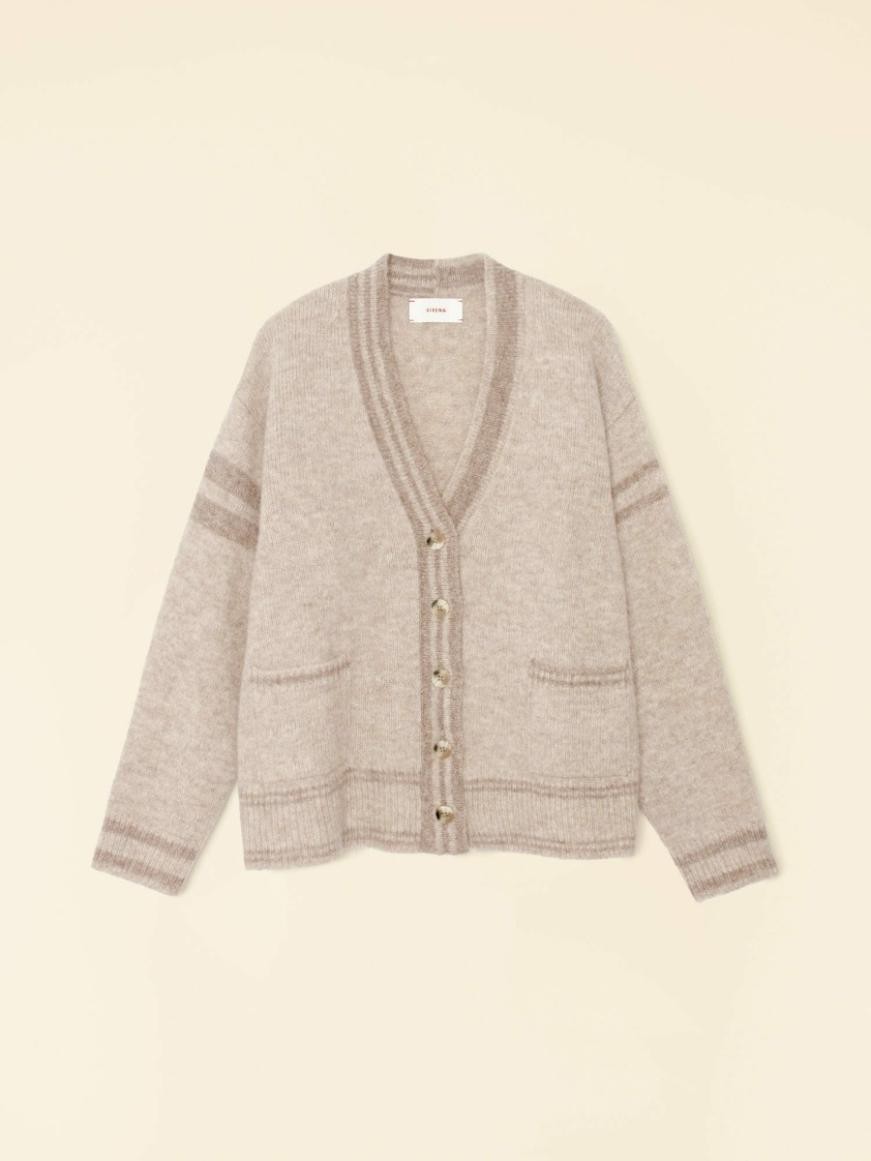 Raidallinen ilo. Carey on tämän kauden uutuus pehmeästä neulotusta babyalpakkasekoituksestamme, joka lisää tekstuuria ja lämpöä. Tässä college-henkisessä V-aukkoisessa neuletakissa on meleerattu kontrastivärinen raitakuosi, etutaskut ja lasketut olkapäät.