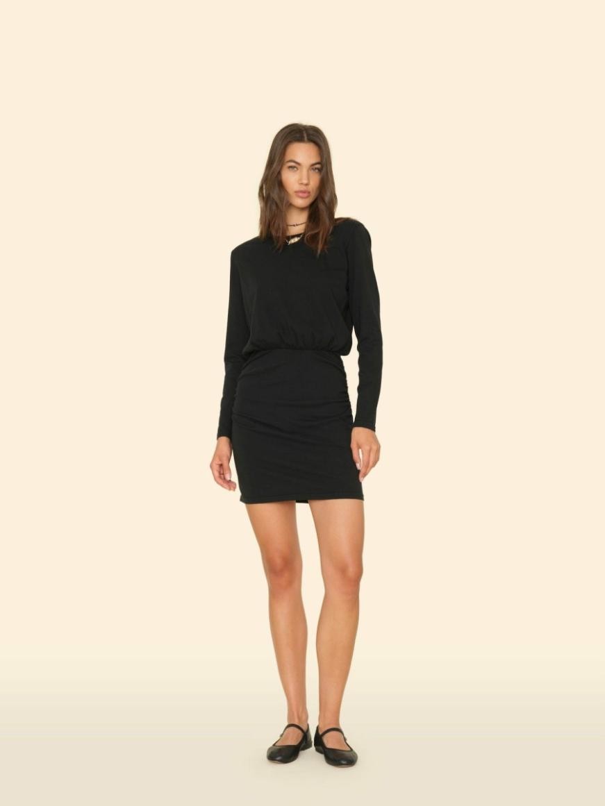Retour aux essentiels. La robe Lula est confectionnée dans notre jersey de coton mi-lourd pour une sensation de douceur et de confort. Lula est une mini-robe à manches longues, col rond et taille élastiquée froncée.