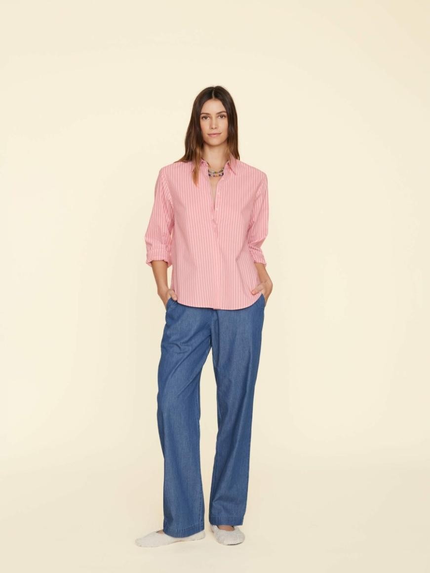 Elegáns nadrágok. Ebben a szezonban megújult, könnyű, puha szövésű pamut chambray anyagunkban az Atticus egy egyenes szárú, felhúzható nadrág rugalmas húzózsinóros derékkal és oldalsó varrásos zsebekkel.