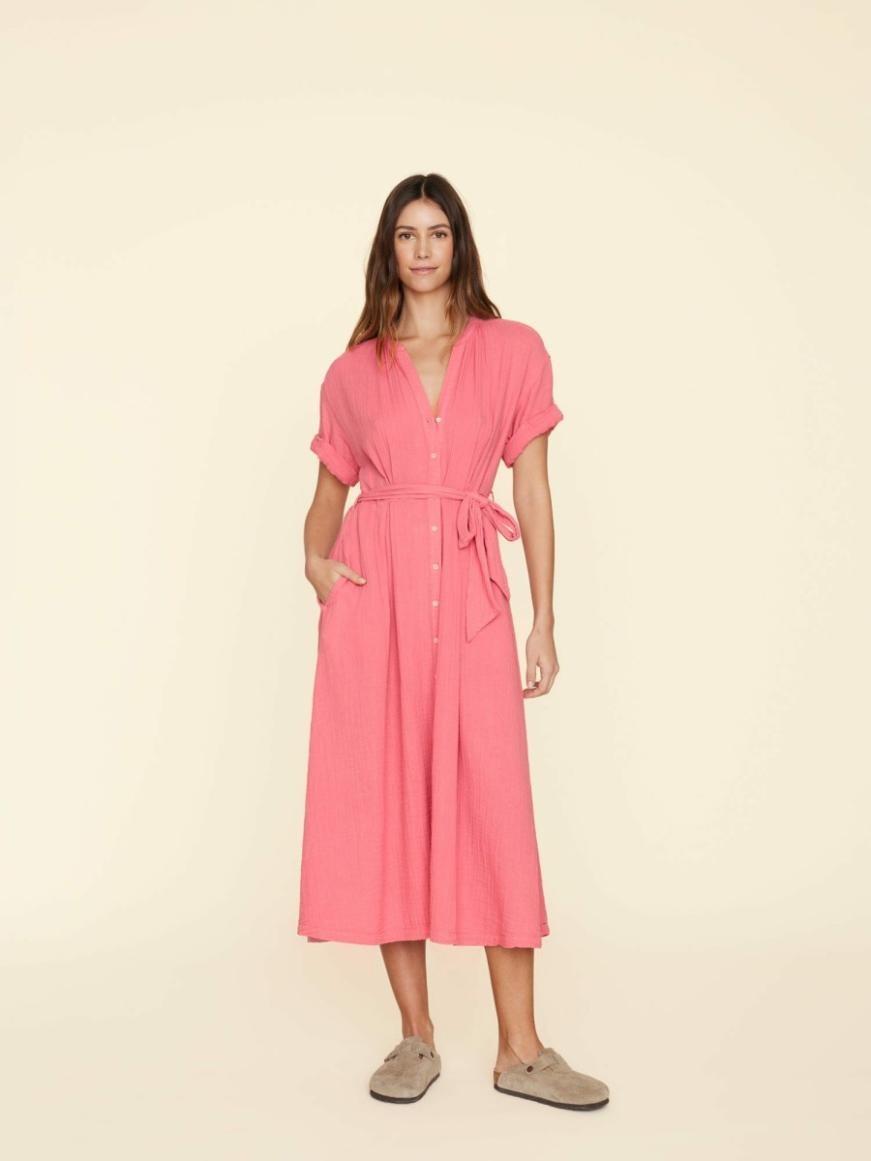 Dőlj az árral! A Cate mosott, kétoldalas pamut gézből készült, puha, enyhén gyűrött érzetet biztosít. Ez a Xirena kedvenc gombos elülső nyílással, A-vonalú szoknyával, oldalsó varrásos zsebekkel és állítható megkötős övvel rendelkezik.