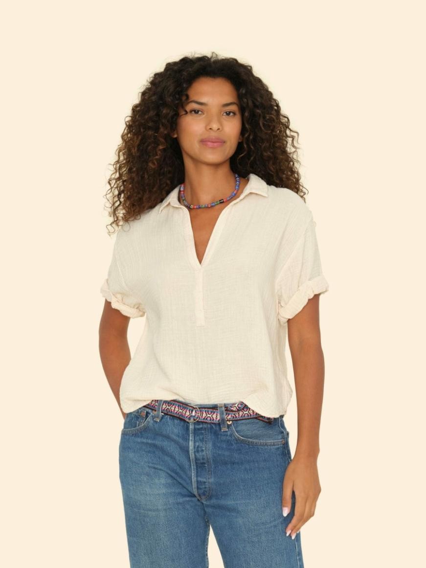 Cruz Control. Mosott, kétoldalas pamut gézből készült, puha, enyhén gyűrött érzetet nyújtó Cruz egy könnyű, V-nyakú, felhajtott ujjú shortfiú.