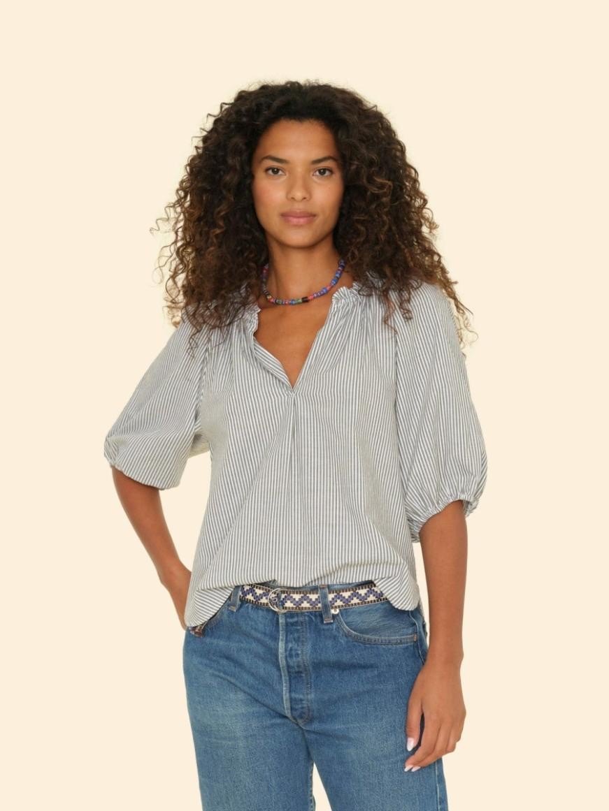 Delizia a righe. Aggiornato questa stagione con il nostro fresco cotone a righe, Jules è un capo semplice con scollo a balze e maniche a palloncino con polsino elastico.
