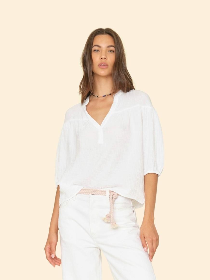 Bare Necessities. Clemは、洗いをかけたダブルフェイスコットンガーゼを使用し、柔らかく、優しくシワ感のある着心地を実現しています。この着やすいポップオーバーは、Vネック、七分袖、シャーリングヨークが特徴です。
