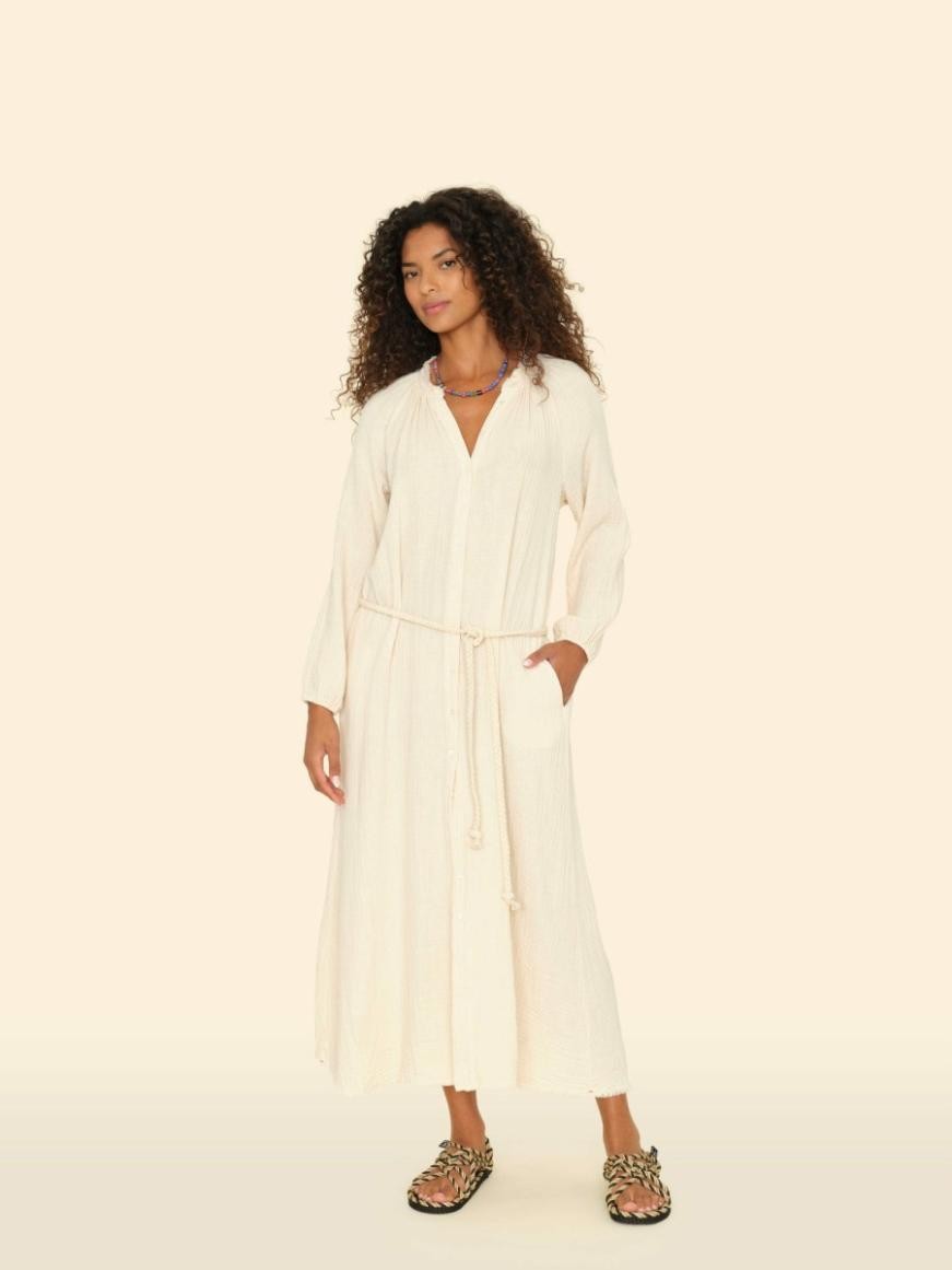 Pretty Please。今シーズンの新作、Andrea は、柔らかく、ややしわのある肌触りのウォッシュ加工ダブルフェイスコットンガーゼを使用。Andrea は、ボタンフロントのミディドレスで、切りっぱなしのネック、ラグランスリーブ、全体にシャーリング、サイドシームポケット、編み込みの共布ベルト、切りっぱなしの裾が特徴です。