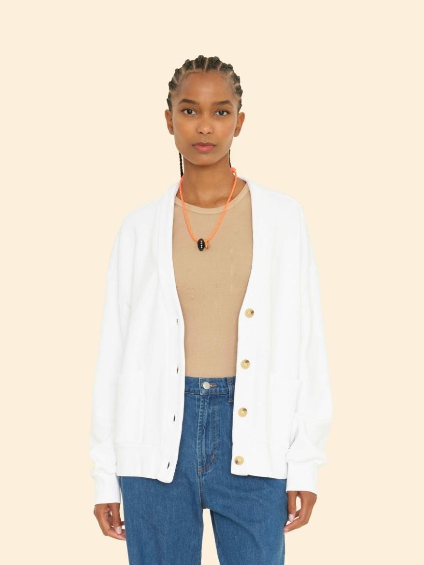(아늑한) 분위기를 연출하세요. 베니(Benny)가 이번 시즌 새롭게 선보이는 매우 부드러운 플리스 소재의 카디건 스웨트셔츠입니다. 이 버튼 프런트 카디건 스웨트셔츠는 깊은 V넥, 긴 소매, 그리고 두 개의 앞면 패치 포켓이 특징입니다.