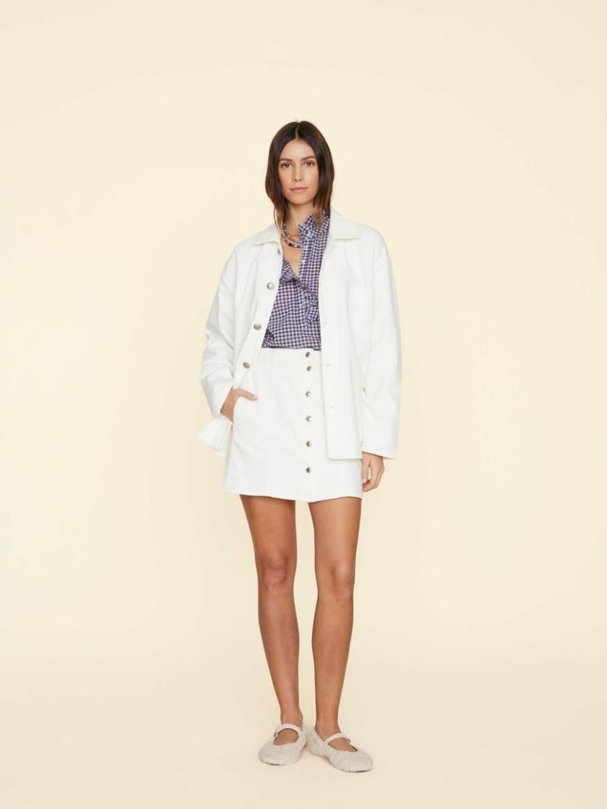 포에버 데님. Sydelle은 이번 시즌 미드웨이트 리사이클 블렌드 데님으로 새롭게 선보입니다. Sydelle은 앞면 버튼 미니 스커트로, 매트 실버 택 버튼, 옆선 포켓, 신축성 있는 뒷허리, 벨트 고리, 앞면 스티치 디테일이 특징입니다.