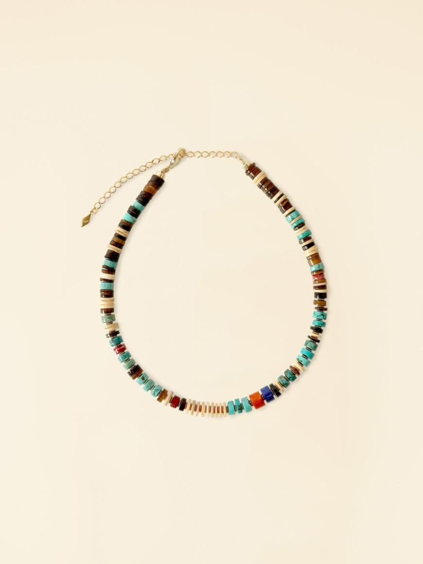 Known for its timeless aesthetic, Gachon Pothier features one-of-a-kind, handmade jewelry pieces with a bohemian style. The Diego Articulated Necklace is a short necklace made of different types of shell, turquoise, jasper, and lapis. Necklace is finished in 18K gold plating.