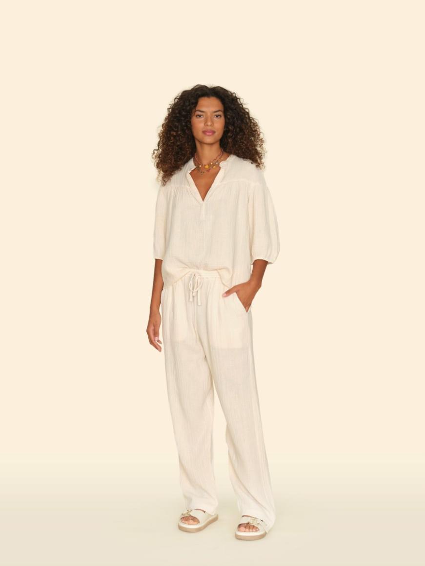 Easy does it. Dylan is made in our washed double faced cotton gauze for a soft, gently crinkled feel. Dylan is a straight leg pant with an elasticized drawstring waist and side seam pockets.