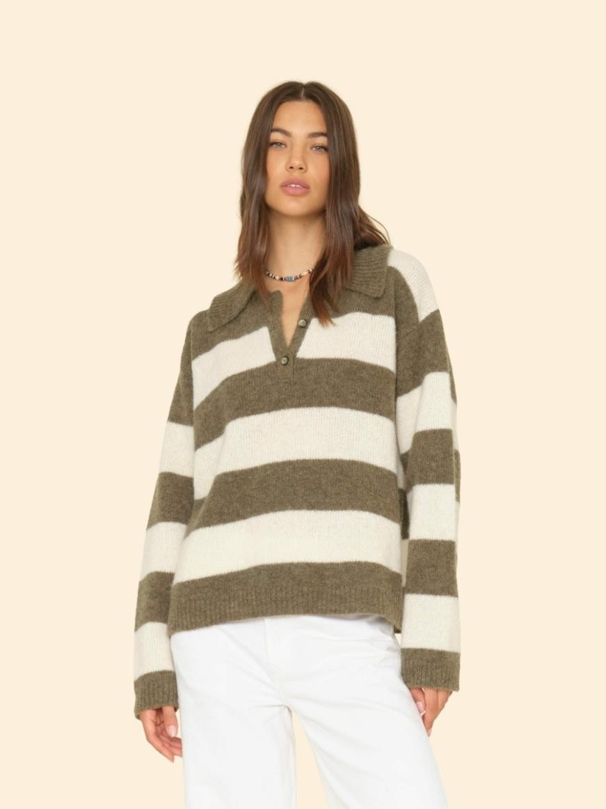 Striped Delight. Benton is new this season in our soft knit baby alpaca blend for added texture and warmth. This collegiate-inspired henley polo sweater features a contrast colored stripe motif, partial button-front, drop shoulders, and a ribbed collar, cuffs, and hem.