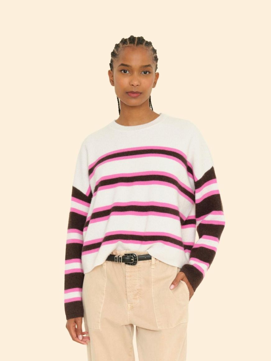 Striped Delight. Lela is new this season in our luxe, ultra-soft cashmere. Lela is a pullover sweater with bold, colorful stripes, drop shoulders and a ribbed crew neck, cuffs, and hem.