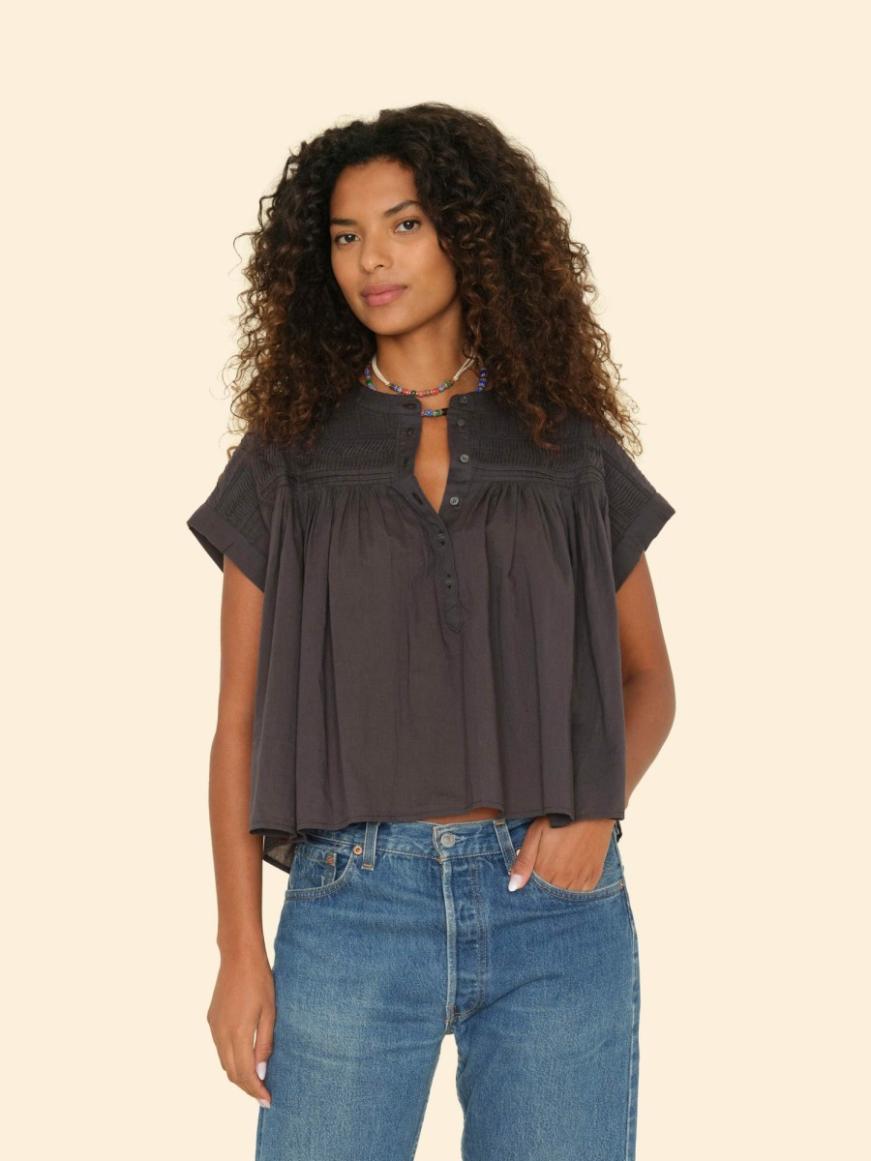 Picture Perfect. Luane is new this season in our superfine cotton voile with a soft hand. Luane is a smocked ultra-femme top with a partial button-front, band collar, lace trim, and shirred front and back yokes.