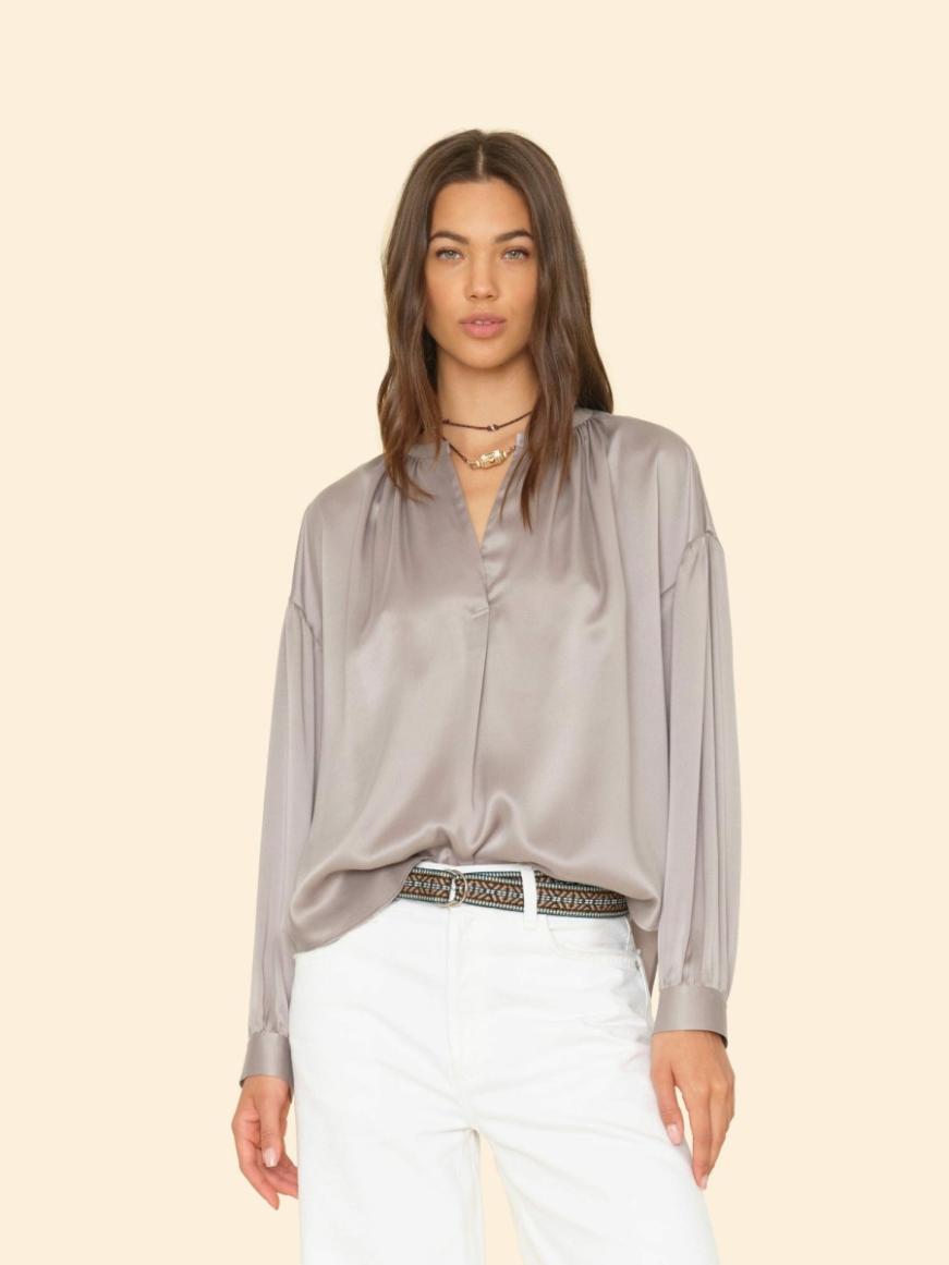 Hidden Gems. Mayson is back this season in our sandwashed silk charmeuse. Mayson has a split neck, drop shoulders, and high low hem. Pair back with the Bella Pant for the ultimate soft tailored look.