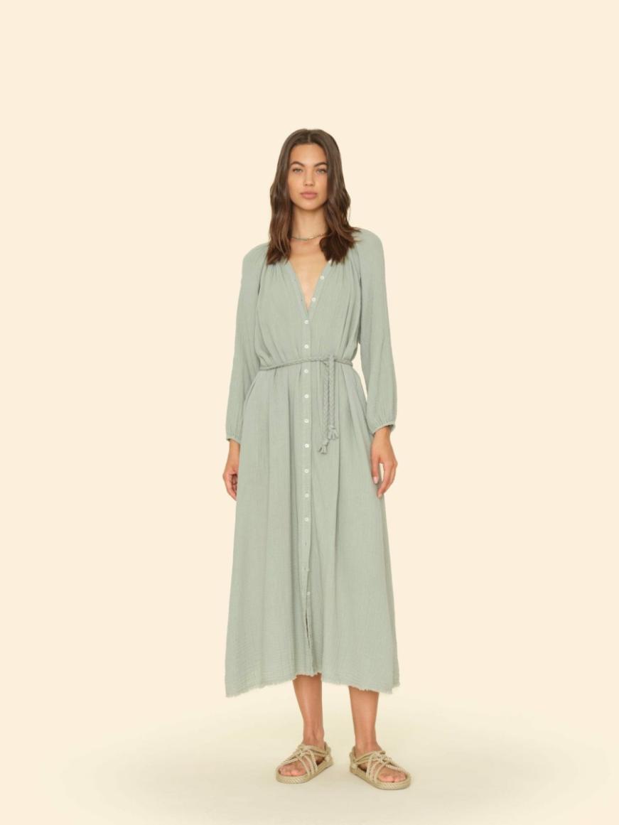 Pretty Please. Andrea is new this season in our washed double faced cotton gauze for a soft, gently crinkled feel. Andrea is a button-front midi dress with a raw edge neck, raglan sleeves, shirring throughout, side seam pockets, braided self-belt, and raw hem.