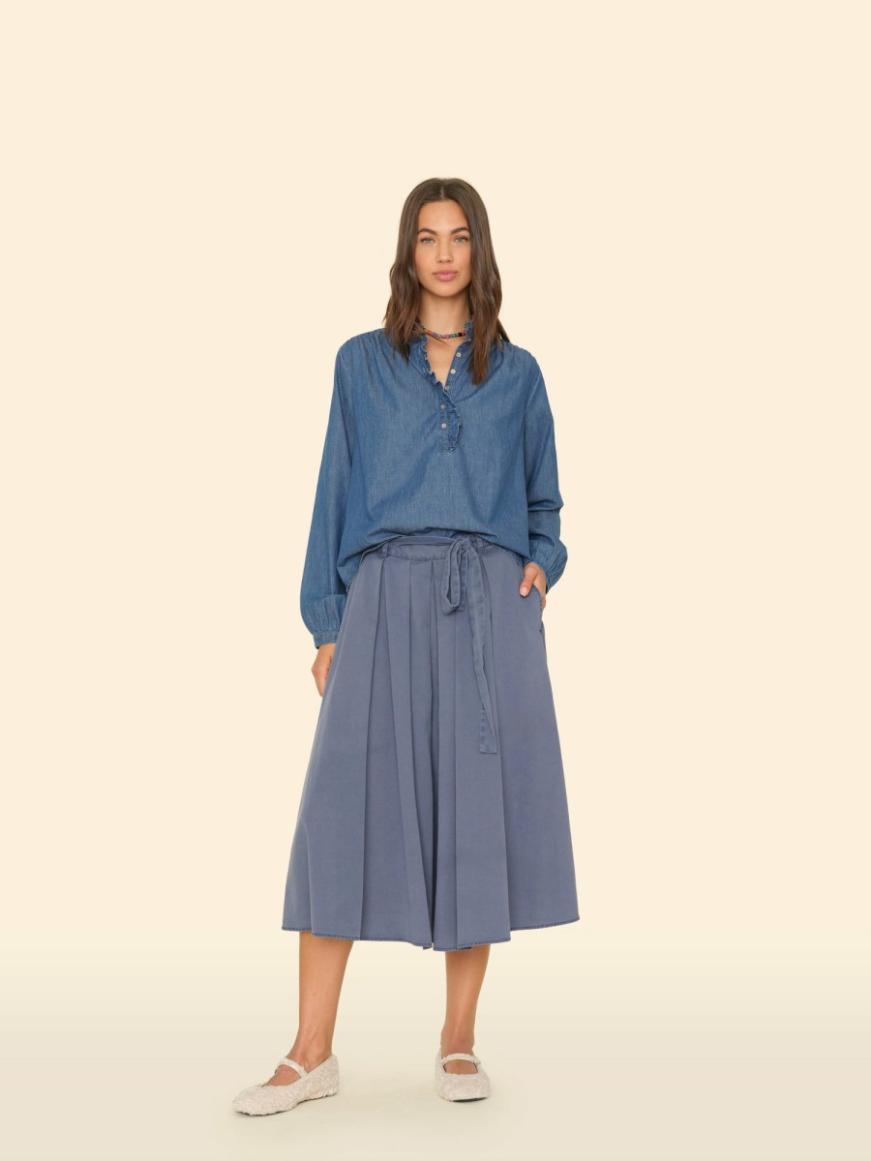 Sitting Pretty. Bellan is new this season in our vintage washed cotton twill. This pleated midi skirt features a self-tie, flat front waistband with elasticized back, and side seam pockets.