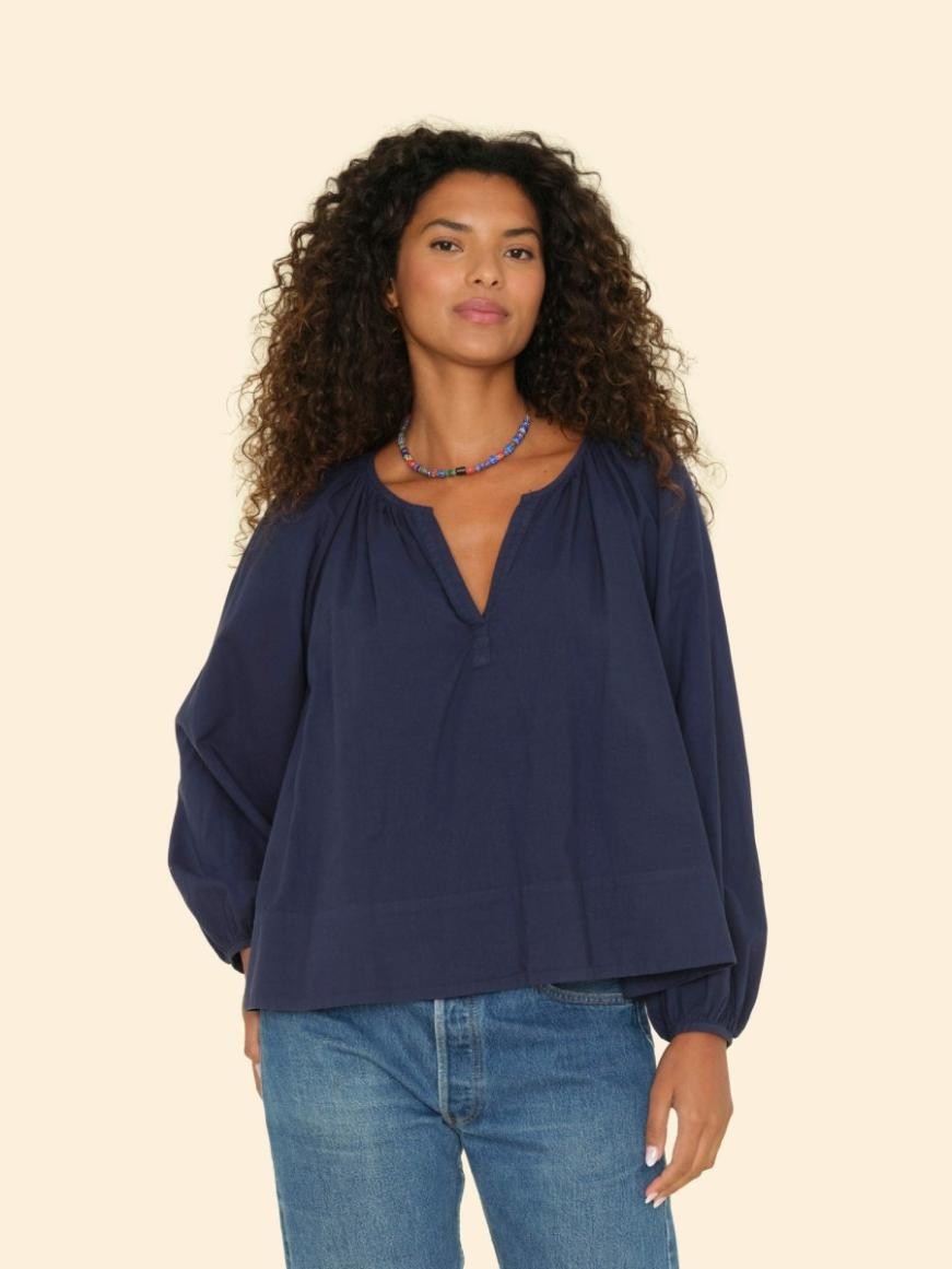 Pretty Please. Harris is new this season in our classic lightweight woven cotton poplin for a lived-in look and feel. This shirred pullover top has a split V-neck, blouson sleeves, and slight high low hem.